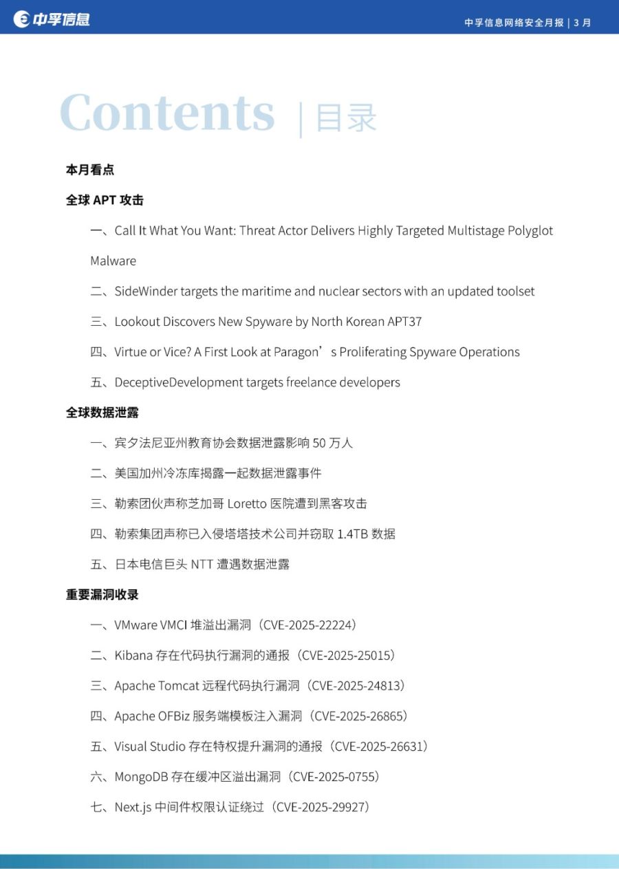 在本月收录的安全漏洞里,影响较大且值得关注的是:Next.js中间件权限认证绕过(CVE-2025-29927); Apache Tomcat 远程代码执行漏洞(CVE-2025-24813); Kibana 存在代码执行漏洞的通报(CVE-2025-25015); VMware VMCI 堆溢出漏洞(CVE-2025-22224)等。