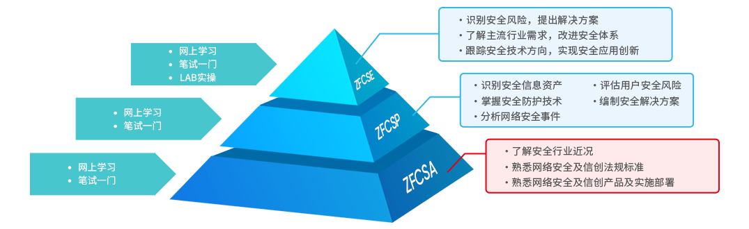 ZhongFu Security Certification 简称ZFSC,是面向安全产品实施、安全运维、安全解决方案类人员的专业技术认证,覆盖安全产品部署实施、安全技能到安全系统架构设计三个等级的技术认证。包括: